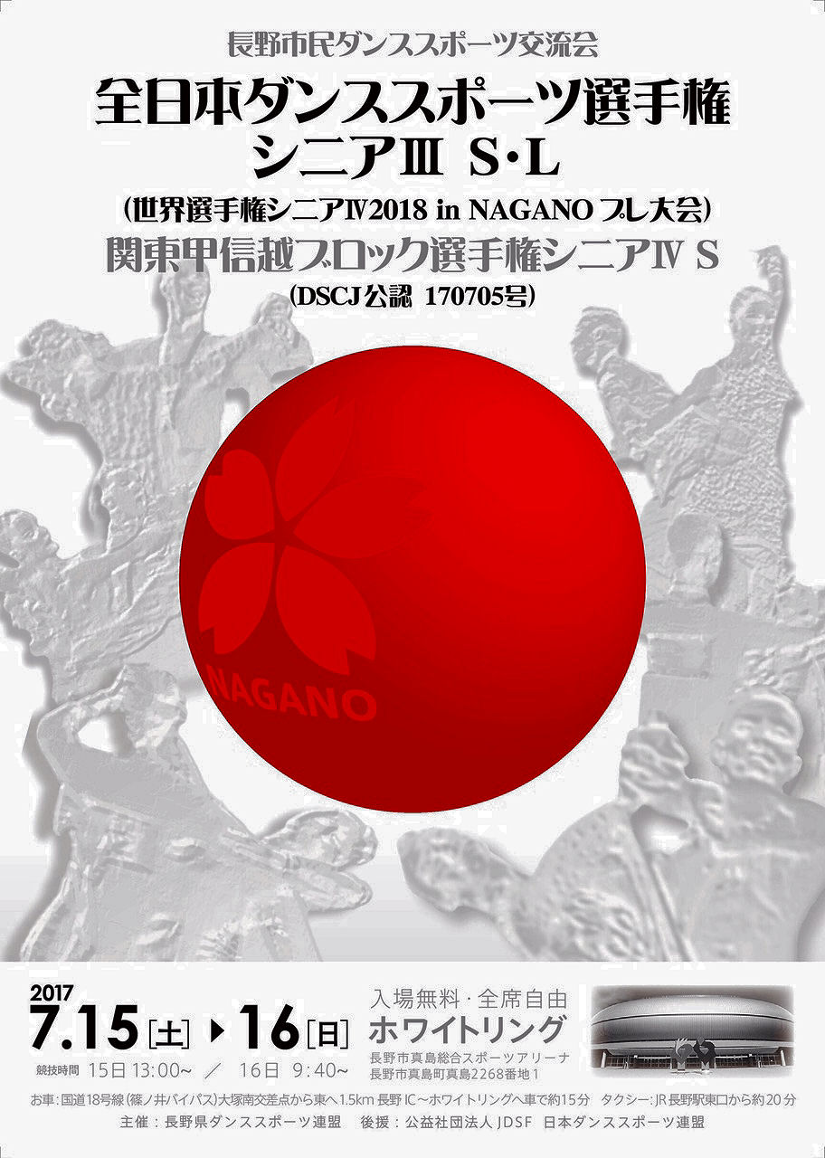 | (世界選手権シニアW2018inNAGANOプレ大会) 全日本選手権シニアV <2018WDSFシニアVスタンダード、シニアWスタンダード世界選手権日本代表選考会> 関東甲信越ブロック選手権シニアW 長野市民DS交流会 (DSCJ公認 170705) 主催:長野県ダンススポーツ連盟 後援:公益社団法人日本ダンススポーツ連盟 |