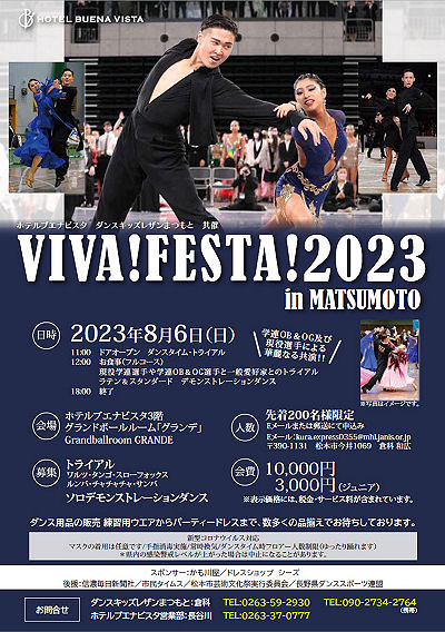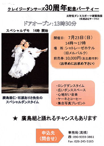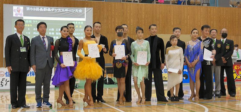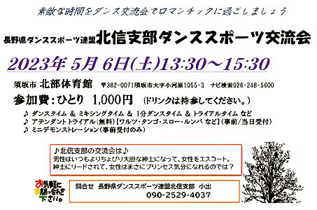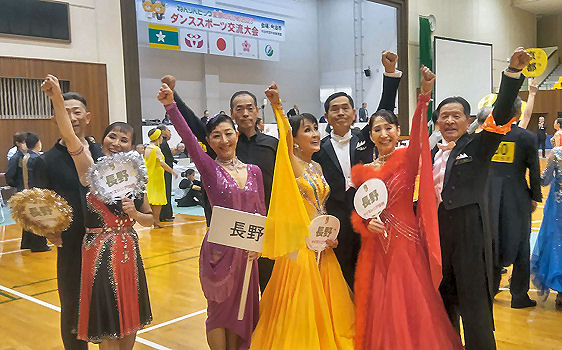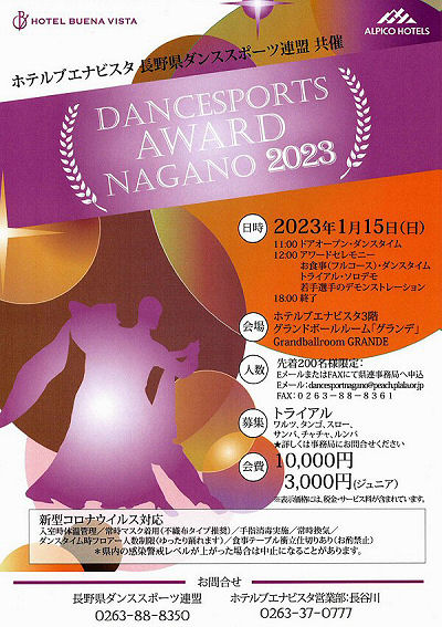 ダンススポーツアワードながの2023 日時: 2023年1月15日(日) 会場: 松本市 ホテルブエナビスタ3階 グランドボールルーム「グランデ」 共催: ホテルブエナビスタ・ 長野県ダンススポーツ連盟 申し込み用紙 (Excel) タイムテーブル ![]() ねんりんピック出場者 技術認定合格者 功労賞表彰 優秀選手賞 ゲストデモンストレーションダンス 長野県ダンススポーツ連盟 北信支部ダンススポーツ交流会 日時: 5月6日(土) 午後1:30〜3:30 会場: 須坂市北部体育館 (ナビ検索026-248-5600) 参加費: ひとり1,000円(飲み物は持参してください) 制限事項: マスク着用/入場時検温/手指消毒、新型コロナウイルス感染対策にご協力をお願いします A5チラシ (PDF)主催: 長野県ダンススポーツ連盟北信支部 第53回長野県ダンススポーツ大会/関東甲信越ブロック団体戦出場選考対象競技会 (公認No. 230529) 日時:2023年5月28日(日)10:00〜17:00 開場 8:30 選手受付:ラテン 8:45〜9:15、スタンダード 11:20〜11:50 会場:ユメックスアリーナ(塩尻市総合体育館) 塩尻市広丘郷原1657-2 駐車場 有空調設備 有 主催:長野県ダンススポーツ連盟 入場料:無料 申込期間:2023年4月3日(月)〜2023年4月25日(火) 申込方法:Webエントリー、又はJDSF標準様式(A4横)エントリーシートを使用してお申し込みください。 (特記事項欄に大会中止時エントリー手続料返金振込先をご記入ください。) 詳細シラバス(オンラインシラバス) エントリーリスト タイムテーブル 選手の皆様へのお願い 観客の皆様へのお願い 会場への地図 駐車場・喫煙場所の案内図 競技結果 ![]() A級戦 ラテン、スタンダード 優勝 小林才時・小西乙愛 組 A級戦 ラテン入賞者 ![]() A級戦 スタンダード入賞者 「ジュニア講習会」〜壷内康文・美和先生〜 「キッズ講習会」 〜須田美咲先生〜 日時:7月1日(土) 13:10〜15:00 団体レッスン 15:10〜21:10 プライベートレッスン 会場:13:10〜17:00 塩尻市、吉田地区センター 多目的ホール (塩尻市広丘吉田2901-3) TEL:0263-86-8611 17:20〜21:00 塩尻市、堅石区民センター ホール (塩尻市広丘堅石599-2) ナビ:0263-52-6101 ジュニア参加の有無、ジュニア指導員参加の有無を6月20日までに、連盟事務局へご連絡ください。 案内シラバス タイムテーブル 申込書 申込み連絡先:長野県ダンススポーツ連盟 事務局 主催:長野県ダンススポーツ連盟 ジュニア育成部 「選手強化部講習会」 日時:2023年7月2日(日) 会場:塩尻市 吉田地区センター 多目的ホール(塩尻北IC 10分程度) 塩尻市広丘吉田2901-3 ナビ用(0263-86-8611) 10:00〜 団体レッスン 13:00〜 個人レッスン 講師:壷内康文・壷内美和先生(JDSF―PD) 詳細シラバス 主催:長野県ダンススポーツ連盟 選手強化部 クレイジーダンサーズ30周年記念パーティー 日時:2023年7月23日(日) 14時〜17時 会場:シャトレーゼホテル(旧メルパルク) ![]() 主催:クレイジーダンサーズ(長野県認定サークル) 後援:長野県ダンススポーツ連盟 VIVA!FESTA!2023 in MATSUMOTO 日時:2023年8月6日(日) 11:00〜18:00 会場:ホテルブエナビスタ 3階 グランドボールルーム「グランデ」 共催:ホテルブエナビスタ、ダンスキッズレザンまつもと 後援:信濃毎日新聞社、市民タイムス、松本市芸術文化祭実行委員会、長野県ダンススポーツ連盟 スペシャルゲスト5組案内 (Excel) 参加申込用紙 (EXCEL) チラシPDF第17回竜の里須坂ダンススポーツ大会 (公認No. 230903) 日時:2023年9月18日(月) 10:00〜17:30 開場 8:30 (選手受付 ラテン 8:45〜9:15、 スタンダードのみ出場者 10:30〜11:00) 会場:須坂市北部体育館 空調設備 無 (長野県須坂市大字小河原1055-3) 駐車場:有り 主催:須坂市スポーツ協会 主管:須坂市ダンススポーツ協会 共催:須坂市、須坂市教育委員会 後援:長野県ダンススポーツ連盟 入場料:無料 申込期間:2023年7月24日(月)〜2023年8月23日(水) 詳細シラバス (オンラインシラバス) エントリーリスト タイムテーブル (PDF) 競技結果 A級 スタンダード入賞者 A級 ラテン入賞者 大会実行委員記念撮影 2023信州ねんりんピック ダンススポーツ交流大会 期日:2023年10月7日(土) 会場:佐久市総合体育館[小アリーナ] (佐久市中込2939) ナビ用0267-62-2020 参加資格:長野県内に在住の60歳以上の方(昭和39年4月1日以前に生まれた方) 開催チラシ (PDF) シラバス・参加申込書 (PDF) 参加申込書(Excel) ※申し込み締め切り : 8月25日(金) 主催:公益財団法人 長野県長寿社会開発センター 競技運営:長野県ダンススポーツ連盟 第23回 関東甲信越ブロック選手権 2023年10月8日(日) 川越運動公園総合体育館 競技結果 都県対抗団体戦 ラテン6位入賞、スタンダード6位入賞 総合6位でした 選手の皆様大変お疲れさまでした ![]() ![]() 毎度恒例の百瀬会長のエール炸裂! がんばるぞ〜! (mp4 音声注意) 第54回長野県ダンススポーツ大会/関東甲信越ブロック選手権シニアW (公認No. 231014) 日時:2023年10月29日(日) 10:45〜18:00 開場時刻 8:30 (選手受付:ラテン 9:00〜9:30、スタンダード 9:00〜11:50) 会場:ANCアリーナ (安曇野市総合体育館) 長野県安曇野市豊科高家4500番地1 (駐車場 有空調設備 有) 主催:長野県ダンススポーツ連盟 入場料: 無料 エントリー申込期間: 2023年9月5日(