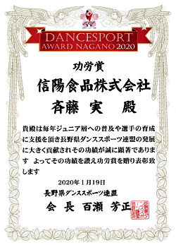 ポンちゃん ラーメン 信陽食品株式会社 本社工場:長野県長野市北条町26番地 TEL: 026-243-2915 FAX: 026-241-9085 信用食品様はスポーツを通じた地域社会への貢献活動を積極的に行われており、 長年に渡り長野県ダンススポーツ大会への協賛をいただき、 ジュニア部門への「ポンちゃんカップ」をご提供いただいています。 2020年の「ダンススポーツアワード」に置いて、長野県ダンススポーツ連盟の発展に対する功績に感謝し 連盟より功労賞を贈らせていただきました。 ![]() ホームページ: http://www.shinyo-f.co.jp/ ![]() ![]() (上記画像は広報誌「クローバー通信」より転載いたしました。) 株式会社 化研工業 本社所在地 〒385-0022 長野県佐久市岩村田3233番地1 TEL. 0267−66−3600 FAX. 0267−66−3606 【長野営業所】 〒381-2241長野県長野市青木島町青木島乙171-1 TEL. 026−214−8757 FAX. 026−214−8758 ホームページ http://kakenkougyou.co.jp/ ![]() |