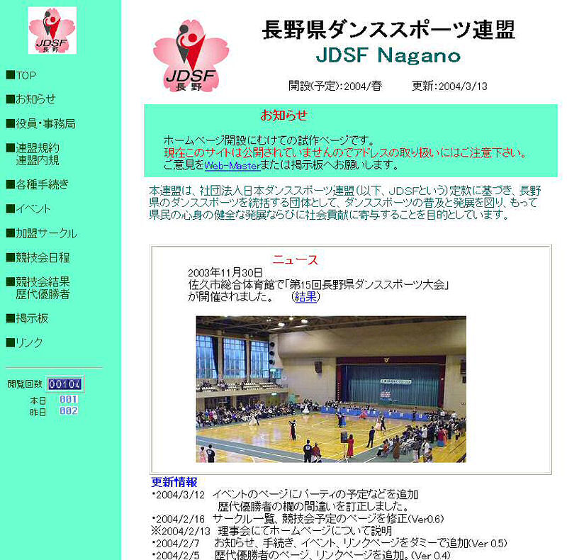 (2004年2月) 別のサイトを使って県連ホームページの開設準備中の物です。 3月1日開設予定となっています。(^^); カウンター19はほとんど管理人の物と思われます。 ![]() (2004年3月) 引き続き試験運転中のページです。 開設予定が春に延期されています。 ![]() (2004年6月1日 ホームページ公開開始) ホームページ開設当時の役員の皆様です。 ![]() ■(2006年11月11日) アクセスが28,000になりました。 ![]() ■(2015年1月16日) 第1世代ホームページの最後の様子です。10年間お疲れ様でした。 ![]() ■(2015年1月24日) リニューアルされて第2世代のホームページがスタートしました。 ![]() ■(2015年4月) メニューの色を春の色に変更しました。 ![]() ■2016年7月 26万カウントとなりました。メニューの色を涼しい水色にしました。 ![]() ■2017年5月 29万カウントになりました。 ![]() ■2017年7月 とうとう30万カウントを超えました。 ![]() |