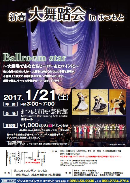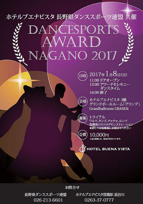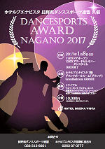 | DANCESPORTS AWARD NAGANO 2017 日時: 2017年1月8日(日曜日) 会場:松本市 ホテルブエナビスタ 3階 グランドボールルーム「グランデ」 11:00 ドアオープン 12:00 アワード・セレモニー ダンスタイム、トライアル、ソロデモ 16:00 終了 ポスターチラシ(PDF) 予定人員: 200名 会費: 10,000円 募集: トライアル ワルツ、タンゴ、チャチャチャ、ルンバ 指導員とのソロ・デモンストレーション 共催: ホテルブエナビスタ、長野県ダンススポーツ連盟 長野県ダンススポーツ連盟北信支部 新春ダンススポーツ交流会 日時: 2017年1月14日(土) 時間: 13:30〜16:00 (受付開始 13:15pm) 会場: 須坂市北部体育館 ポスターチラシ(PDF)会費: 1,000円 (飲み物付き) 内容: オールダンスタイム 主催: 長野県ダンススポーツ連盟北信支部 共催: 須坂市ダンススポーツ協会 新春 大舞踏会 in まつもと 日時: 2017年1月21日(土) 会場:松本市 まつもと市民芸術館 主ホール 時間:PM3:00〜7:00 ポスターチラシ(PDF)会費: 1,000円 (税込)ドリンク付 主催: ダンスキッズレザンまつもと、松本市芸術文化振興財団 後援:長野県ダンススポーツ連盟、松本市、その他 第5回長野県ダンススポーツフェスティバル 開催趣旨: ダンス愛好家の親睦と理解を深める 日時: 2017年2月26日(日) 9:00〜17:00 (会場 am8:30) 開始予定9:30 会場: 塩尻市広丘小学校体育館 (塩尻市広丘原新田116) ナビ用電話(0263-52-0742) 内容: 第1部 サークル発表(順位付けなし) 1部、2部参加者 (PDF) 第2部 トライアル(順位付けなし) 第3部 普及競技会(順位付け・表彰有り) 3部参加者 (PDF) 詳細シラバス エントリー申込書 (PDF) タイムテーブル AM PM (PDF) 主催: 長野県ダンススポーツ連盟 長野県DSC総会、スキルアップ講習会、交流会 日時: 2017年3月5日(日) 会場: 長野市運動公園体育館 2F サブアリーナ (長野市吉田5-1-19) (ナビ用TEL: 026-244-7555) 内容: 長野県DSC総会 11:30〜 講習会 13:00〜16:00 「山口新語のリズムメソッド」 講師、山口新語先生 (一般の方の参加費:1,000円) 交流会 17:00〜19:30 (一般の方の参加費: 1,000円) 主催: 長野県DSC 長野県ダンススポーツ連盟北信支部 第2回ダンススポーツフェスティバル 日時: 2017年3月18日(土) 9:00〜16:30 会場: 須坂市北部体育館 交流会参加費: 1,500円(飲み物付き) JDSF会員1,000円 内容: 第1部 サークル発表 第2部 トライアル(9:50am〜) 第3部 交流会(13:30〜16:30) 広告ビラ(PDF) 詳細シラバス申込書 (PDF) (エクセル) 主催: 長野県ダンススポーツ連盟北信支部 共催:須坂市ダンススポーツ協会 長野県ダンススポーツ連盟北信支部 ダンススポーツ交流会 日時: 2017年4月22日(土) 13:30〜16:30 会場: 須坂市北部体育館 参加費: 1,500円(飲み物付き) JDSF会員1,000円 宣伝用ビラ (PDF) 主催: 長野県ダンススポーツ連盟北信支部 共催:須坂市ダンススポーツ協会 2017年度長野県ダンススポーツ連盟通常総会 新体制に移行しました。 2017年4月23日(日) 塩尻市、広丘公民館会議室 長野県ダンススポーツ連盟通常総会 高橋 淳、旧会長から百瀬芳正、新会長へバトンタッチ 本部長・支部長など新旧役員の皆さん ●第44回長野県ダンススポーツ大会 日時: 2017年5月7日(日) 開場8:30 競技予定9:40〜18:00 選手受付: ラテン8:45〜9:15 スタンダード11:00〜11:30 (状況により変更の場合もあります) 会場: 佐久市総合体育館 (佐久市中込中込原北2939) 空調設備:無 駐車場:有り 詳細シラバス(訂正3版)(PDF) 参加者リスト タイムテーブル (PDF) 競技結果 ![]() 主催: 長野県ダンススポーツ連盟 2017年度 JDSF公認長野県指導員研修会 日時: 2017年5月28日(日) 9:30〜17:00 会場: 梓川体育館 松本市梓川梓816 詳細シラバス (PDF) 講師: JDSF PD 壷内 康文・美和先生 ![]() 主催: 長野県ダンススポーツ連盟指導部 講習会と交流会 選手強化部、ジュニア育成部、長野県DSC共催 日時: 7月1日(土) 会場: 須坂市北部体育館 (須坂市大字小河原2005-1) 1.ジュニア講習会 10:00〜12:00 中学生以下¥500、高校生¥1,000 2.カップル個別レッスン 12:30〜15:20 3.一般講習会 16:00〜18:00 ¥1,000 JDSF技術認定会HG3フィガーを題材にワルツの講習。 一般ダンス愛好者、競技選手、指導員、どなたでもOK。 おひとりでの参加も可。 4.交流会 18:30〜20:30 ¥1,000 どなたでも参加できます。 〇講習会、カップル個別レッスンの講師は、JDSF公認審判員、元全日本10ダンスチャンピオン、元全日本スタンダードチャンピオン 渡辺和昭・裕美組 わかりやすく、審判員からの観点での講習は定評があります。 主催:長野県ダンススポーツ連盟 選手強化部、ジュニア育成部、長野県DSC 問合せ: ジュニア関係、小出美恵子 選手強化部、後藤 晋 第11回北信越選手権大会 日時:7月2日 会場:新潟県長岡市みしま体育館 長野県勢は A級ラテン和田勝年・羽場薫組7位 シニアVA級スタンダード岡田明義・祐子組準優勝 シニアVA級ラテン戸谷健一郎・宇賀神しげ子組準優勝 プレジュニアスタンダード東海林麻利・橋本沙樹4位 同ラテン4位 と健闘致しましたが、残念ながら連覇はなりませんでした。 結果は1位富山県、2位新潟県、3位長野県でした。 選手の皆様ご協力大変ありがとうございました。 (世界選手権シニアW2018inNAG