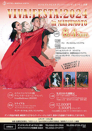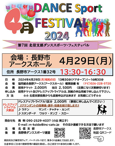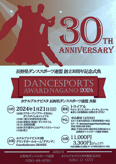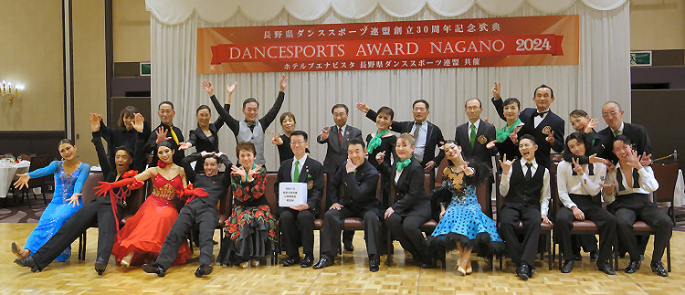 | 長野県ダンススポーツ連盟創立30周年記念式典&アワードながの2024 日時:2024年1月21日(日) 10:00〜17:20 会場:松本市、ホテルブエナビスタ 3階グランドボールルーム「グランデ」 ご案内(詳細) 参加申込書 ホテルブエナビスタまでのアクセス 駐車場のご案内 たくさんのお客様にご参加いただき盛大に開催することが出来ました。遠くからの御来賓の皆様大変ありがとうございました。 御来賓 布村JDSF会長 功労者表彰 ねんりんピック出場の皆様 技術認定会合格者 特別優秀選手賞、スペシャルデモの皆様 【ご報告・お礼】 能登半島地震災害の義援金箱を設置いたしましたところ67,534円もの募金が集まりました。 JDSFの募金案内に従って、日本スポーツ協会へ振込させていただきます。皆さまのご協力大変ありがとうございました。 チラシ (PDF)共催:ホテルブエナビスタ・長野県ダンススポーツ連盟 南信支部Springパ−ティ−(南信ジュニア支援パ−ティ−) 日時:4月14日(日) PM2時〜4時 場所:サンビレッジ体育館 (伊那市西箕輪3940-2) ナビ用(0265)76-7099 伊那インタ−から5分 参加費:会員800円 非会員1000円 飲み物お菓子用意してお待ちしています。 内容:トライアル WTRC、ジュニア発表会他 主催:長野県ダンススポ−ツ連盟南信支部 問合わせ:090-7281-7003(向山) 第7回 北信支部ダンススポーツ・フェスティバル 日時:2024年4月29日(月・祝日)13時30分(ドアオープン)〜16時30分 会場:長野アークス(アークスホール) 主催:北信支部 開催チラシ(PDF) 前売チケット&トライアル申込書(PDF) (Excel) タイムテーブル (PDF) ![]() 2024年度 長野県ダンススポーツ連盟定時総会 が開催されました。 日時:2024年4月28日(日) 15:00〜16:00 会場:塩尻市総合文化センター 2F 大会議室 議事の慎重審議が行われ、全ての議案が承認されました。 Zoomによるオンライン配信のテスト運用も行われました。 第55回長野県ダンススポーツ大会 (公認No. 240611) /関東甲信越ブロック選手権シニアW /関東甲信越ブロック団体戦出場選考対象競技会 日時:2024年6月9日(日) 10:00〜17:00 開場8:30 (選手受付 ラテン8:45〜9:15、スタンダード 8:45〜11:50) 会場: ユメックスアリーナ(塩尻市総合体育館) (塩尻市広丘郷原1657-2) (空調設備 有 、駐車場 有) 会場アクセス図 ユメックスアリーナ敷地全体見取り図 入場料:無料 申し込み期間:2024年4月16日(火)〜2024年5月9日(木) オンラインシラバス ・第55回タイムテーブル ・観戦見学される皆様へ ・出場される選手の皆様へ 競技技結果 ![]() 主催:長野県ダンススポーツ連盟 VIVA!FESTA!2024 in MATSUMOTO 日時:2024年8月4日(日) 11:00ドアオープン〜18:00終了 会場:ホテル ブエナビスタ 3階 グランドボールルーム「グランデ」 共催:ホテルブエナビスタ、ダンスキッズレザンまつもと 後援:信濃毎日新聞社、市民タイムス、松本市芸術文化祭実行委員会、長野県ダンススポーツ連盟 参加申込用紙 (EXCEL) 申込み受付期間:2024年5月15日(水)〜7月16日(火) 2024年 選手強化部・ジュニア育成部 講習会 日時:2024年8月24日(土) 10:00〜17:00 会場:塩尻総合文化センター (塩尻市大門7-4-3) ナビ用(0263-54-1253) 詳細シラバス 午前:ジュニア育成部 講習会 ![]() ![]() 午後:選手強化部 講習会 ![]() ![]() ![]() 講師:PD壷内康文・美和先生 ジャーマンオープン2024 PDマスターIIスタンダード 3位のメダルも見せていただきました。 主催:長野県ダンススポーツ連盟 選手強化部 ジュニア育成部 2024年度 JDSF公認長野県指導員研修会 日時:2024年8月25日(日) 9時30分〜16時00分 会場:松本市総合体育館(エア・ウォーターアリーナ松本)2F サブアリーナ (長野県松本市美須々5-1) 実技講習: PD 壷内康文・美和先生 シラバス ![]() ![]() 須坂市制施行70周年記念 第18回竜の里須坂ダンススポーツ大会 (公認No.240904) 日時:2024年9月16日(月) 10:00〜18:00 (開場時刻 8:30) (選手受付:ラテン8:45〜9:15 スタンダードのみの選手10:30〜11:00) 会場:須坂市北部体育館 (空調設備:無) 長野県須坂市大字小河原1055-3 (駐車場:有り) 入場料:無料 エントリー申込期間:2024年7月17日(水)〜2024年8月16日(金) オンラインシラバス 競技結果 ![]() 主催:須坂市スポーツ協会 主管:須坂市ダンススポーツ協会 共催:須坂市、須坂市教育委員会 後援:長野県ダンススポーツ連盟 第56回長野県ダンススポーツ大会/関東甲信越ブロック選手権シニアU 第16回北信越ダンススポーツ選手権大会 日時:2024年10月27日(日) 10:45〜18:00 開場9:00 (選手受付ラテン9:30〜10:00、スタンダード 9:30〜12:20) 会場:ANCアリーナ (安曇野市総合体育館) 空調設備 有 /駐車場 有 (長野県安曇野市豊科高家4500番地1 ) 主催:長野県ダンススポーツ連盟 エントリー申込期間:2024年9月5日(木)〜2024年9月26日(木) オンラインシラバス 1. 56回大会へ出場される選手の皆様へ 2. 56回大会を見学応援される観客の皆様へ 3. 会場構内案内図 4. 周辺地図 第16回北信越選手権団体戦は長野県が優勝いたしました。 競技結果 ![]() ![]() ![]() ![]() 大会実行委員の皆さん 第24回関東甲信越ブロック選手権 10月13日(日)、神奈川県川崎市、カルッツかわさきで行われた、都県対抗団体戦で 長野県チームは 