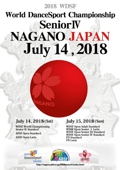 | __July 14 (Sat) _____WDSF World Championship Senior IV Standard _____ADSF Open Standard _____ADSF Open Latin __July 15 (Sun) _____WDSF Open Adult Standard _____WDSF Open Senior I Latin _____WDSF Open Senior III Standard _____WDSF Open Senior IV Standard _____PD Standard (Domestic, but overseas couples may enter) _____PD Latin (Domestic, but overseas couples may enter) _____NAGANO JAPAN |