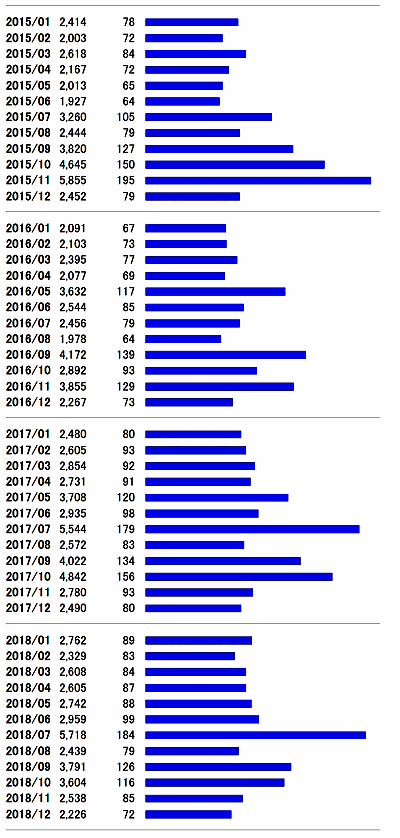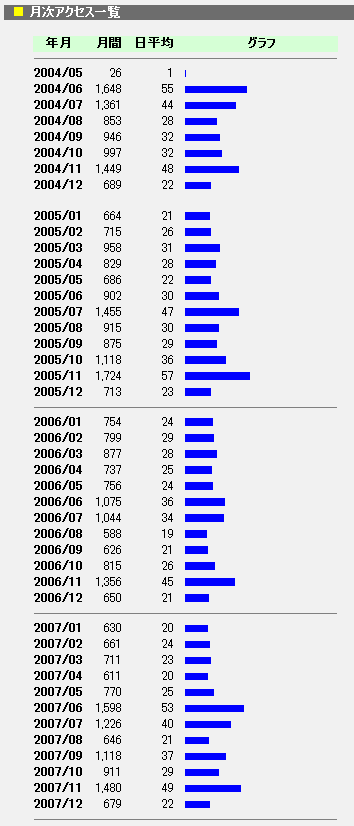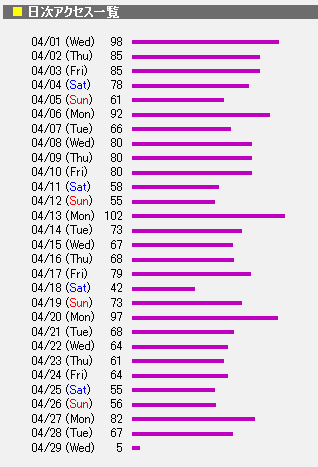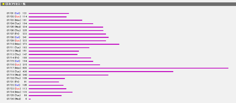 | ■ 2004年のホームページ開設時からのアクセスカウンターの推移です。 インターネットの普及もありの訪問者が増えている様子がわかります。 県大会の前後月でアクセスが多くなっています。 ![]() ![]() ![]() ・2015年11月はホワイトリングで「第17回関東甲信越ブロック選手権」と松本市で「第41回長野県ダンススポーツ大会」が行われ、 月間アクセス数が過去最多となりました。 ・2017年7月はホワイトリングで「全日本選手権シニアV」と「関東甲信越ブロック選手権シニアW」が行われ、アクセスが多くなりました。 ・2020年はコロナ禍のため県大会が開催出来ず、ホームページのアクセスもピークが有りません。 ・2021年は10月に県大会が行われ、アクセスのピークが現れています。 ■2015年4月のアクセスカウンターの推移です。 週末のアクセスが少なく、月曜日の訪問が多くなっています。 ![]() ■2017年7月の日ごとのアクセス推移です。 7月15-16日にホワイトリングで「全日本選手権シニアV」と「関東甲信越ブロック選手権シニアW」が行われ、 大会前は「タイムテーブル」と「エントリーリスト」の掲載に合わせてアクセスが増えています。 大会翌日は「競技結果」の掲載に合わせてアクセスが急増し、過去最高の日次アクセスを記録しました。 ![]() |