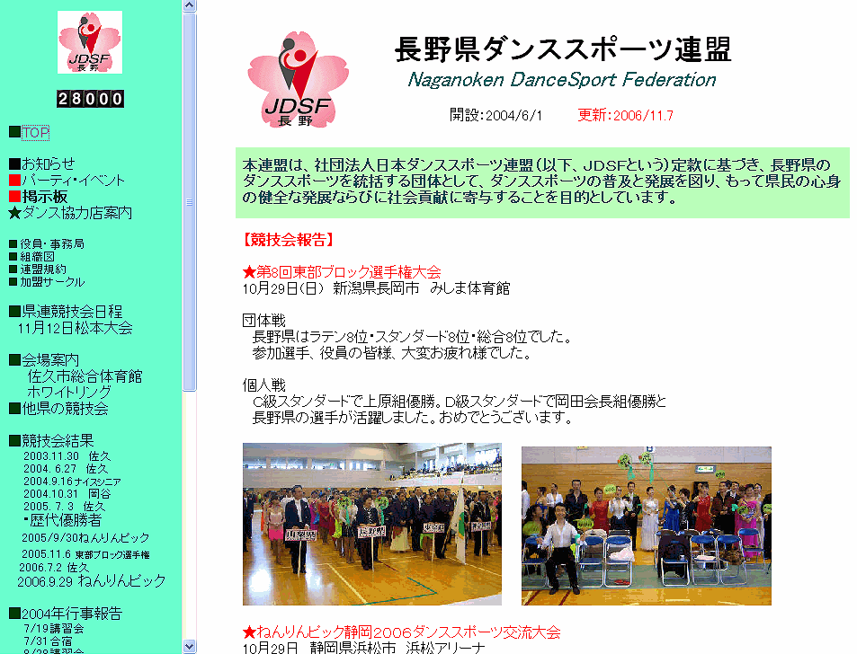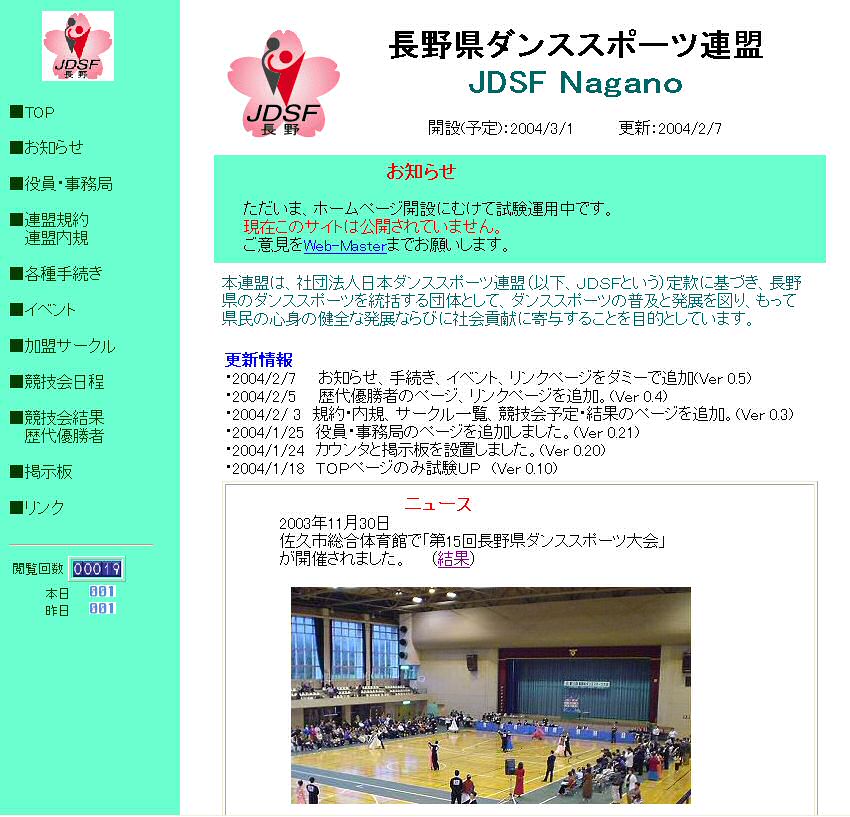 (2004年2月) 別のサイトを使って県連ホームページの開設準備中の物です。 3月1日開設予定となっています。(^^); カウンター19はほとんど管理人の物と思われます。 ![]() (2004年3月) 引き続き試験運転中のページです。 開設予定が春に延期されています。 ![]() (2004年6月1日 ホームページ公開開始) ホームページ開設当時の役員の皆様です。 ![]() ■(2006年11月11日) アクセスが28,000になりました。 ![]() ■(2015年1月16日) 第1世代ホームページの最後の様子です。10年間お疲れ様でした。 ![]() ■(2015年1月24日) リニューアルされて第2世代のホームページがスタートしました。 ![]() ■(2015年4月) メニューの色を春の色に変更しました。 ![]() ■2016年7月 26万カウントとなりました。メニューの色を涼しい水色にしました。 ![]() ■2017年5月 29万カウントになりました。 ![]() ■2017年7月 とうとう30万カウントを超えました。 ![]() |